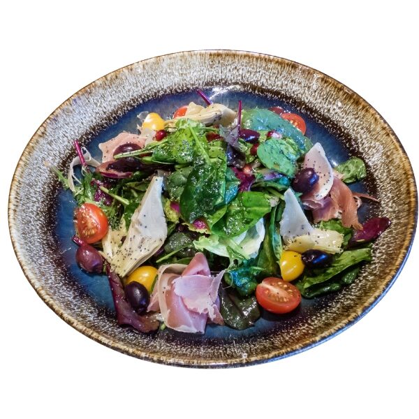 / салатен микс, артишок, прошуто, нар, червен лук, масини, чери домати, нахут, соево-горчичен дресинг /