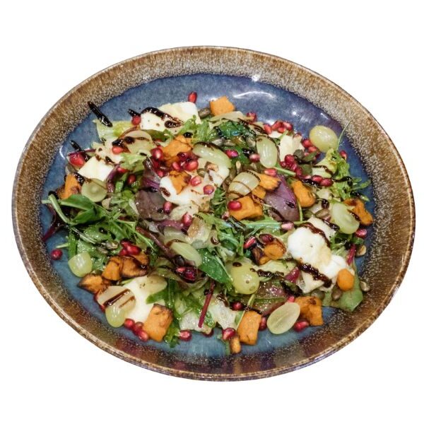 / микс листни салати, сирене халуми, тиква, нар, тиквени семки, грозде, балсамова редукция, микроси /