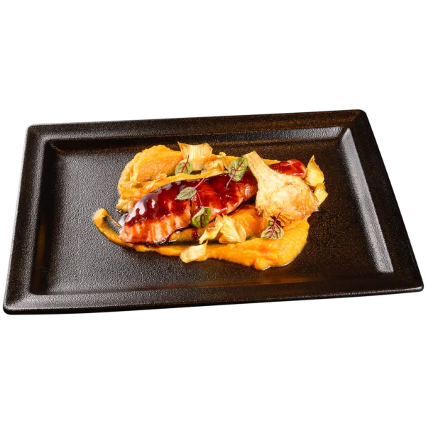 СЬОМГА ТЕРИЯКИ С ПЮРЕ ОТ ТИКВА И ЧИПС ОТ АРТИШОК