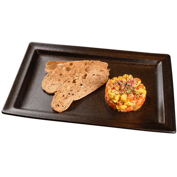 / сьомга, авокадо, соев сос, сладко чили, пресен лук, лайм, микроси, брускети от черен хляб /