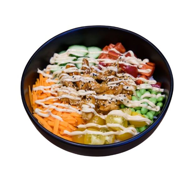 / пилешко филе, тирияки сос, ориз басмати, краставица, червена чушка, едамаме, морков, чълто чери /
