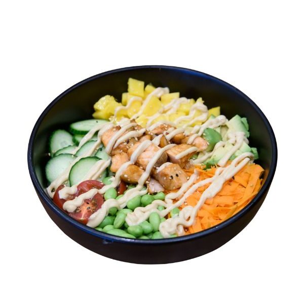 / сьомга, манго, авокадо, морков, чери домат, пресен лук, краставица, ориз басмати, терияки сос, сусам, соево-чеснова майонеза /
