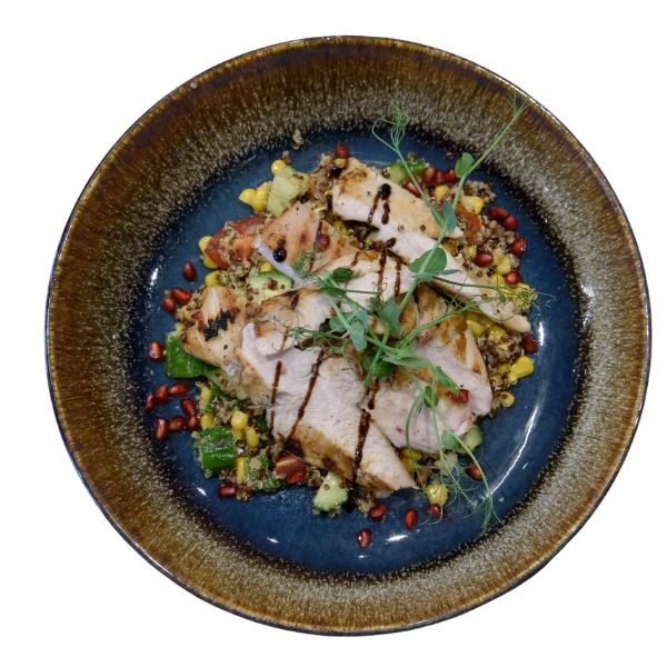 / пуешко филе, киноа, царевица, чери домати, краставица, лимонов дресинг, микроси /