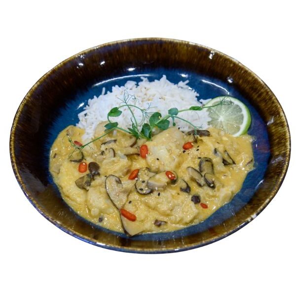 / морски език, гъби шийтаке, лук шалот, люта чушка, къри паста, кокосово мляко,лимоново трева, жасминов ориз, микроси /