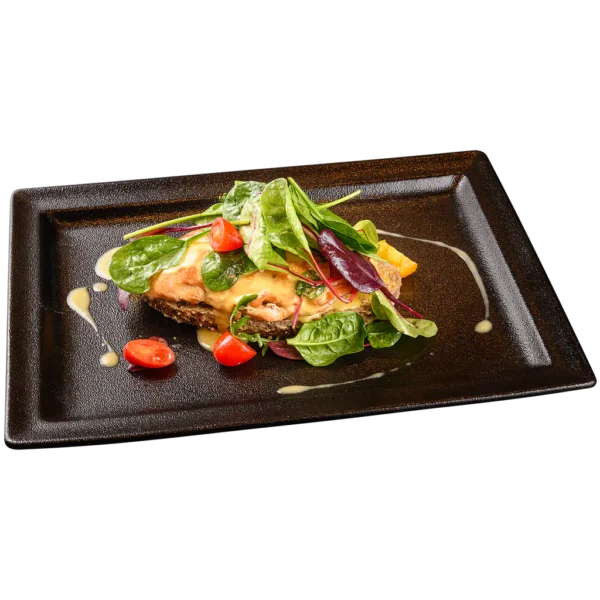 / върху канапе от хляб със златна коричка, сос Холандез и свежа салата с чери домати /