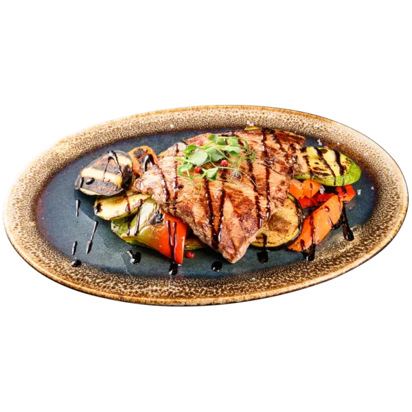 /свинско бонфиле, гриловани зеленчуци, балсамова редукция, песто /