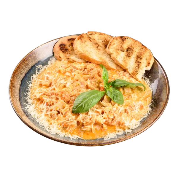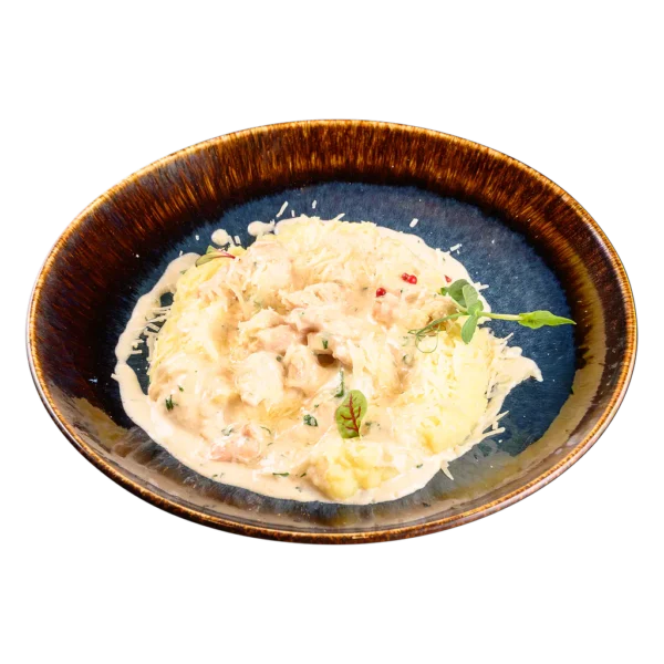 / пилешки жулиени, сметана, пармезан, чесън, картофено пюре, магданоз /