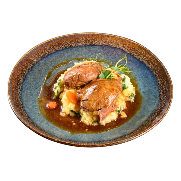 / свинско месо, гъби, картофено пюре с бейби спанак, печен сос /