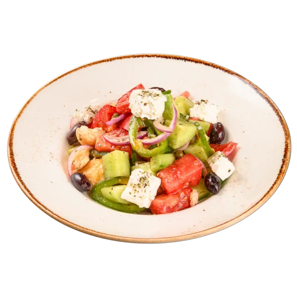 / домати, краставици, червен лук, зелена чушка, маслини, фета сирене, каперси, риган, крутони /