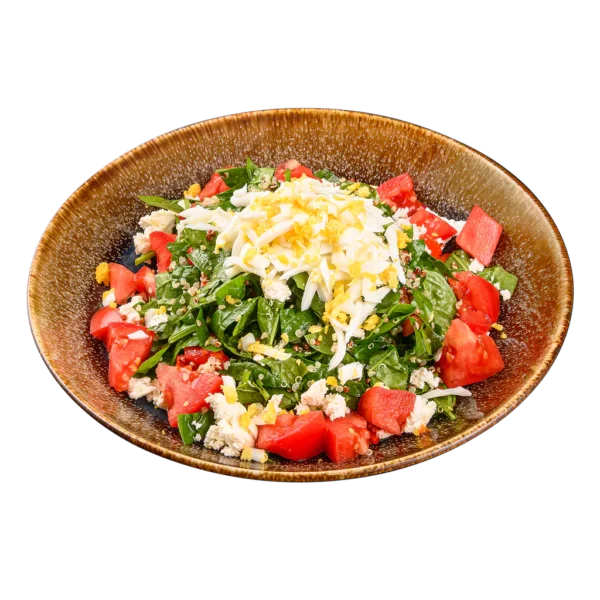 / пресен спанак, печен пипер, домат, фета сирене, настъргано яйце, киноа, соево-горчичен дресинг/