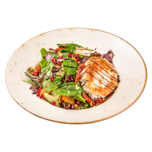 / микс листна салата, печено козе сирене, сушен домат, карамелизирани орехи , сушени плодове, нар, дресинг /