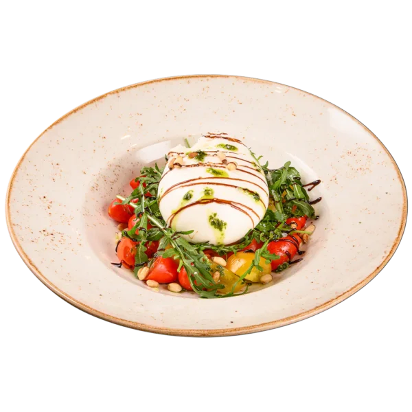 / бурата, кедрови ядки , песто, рукола, балсамова редукция, чери домати-зима или розови домати-лято/