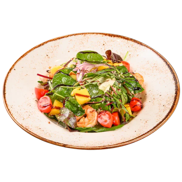 / микс зелени салати, киноа, чери домати, манго, скариди, червен лук, овкусени със соево-горчичен и цитрусов дресинг, гарнирани с балсамова глазура /